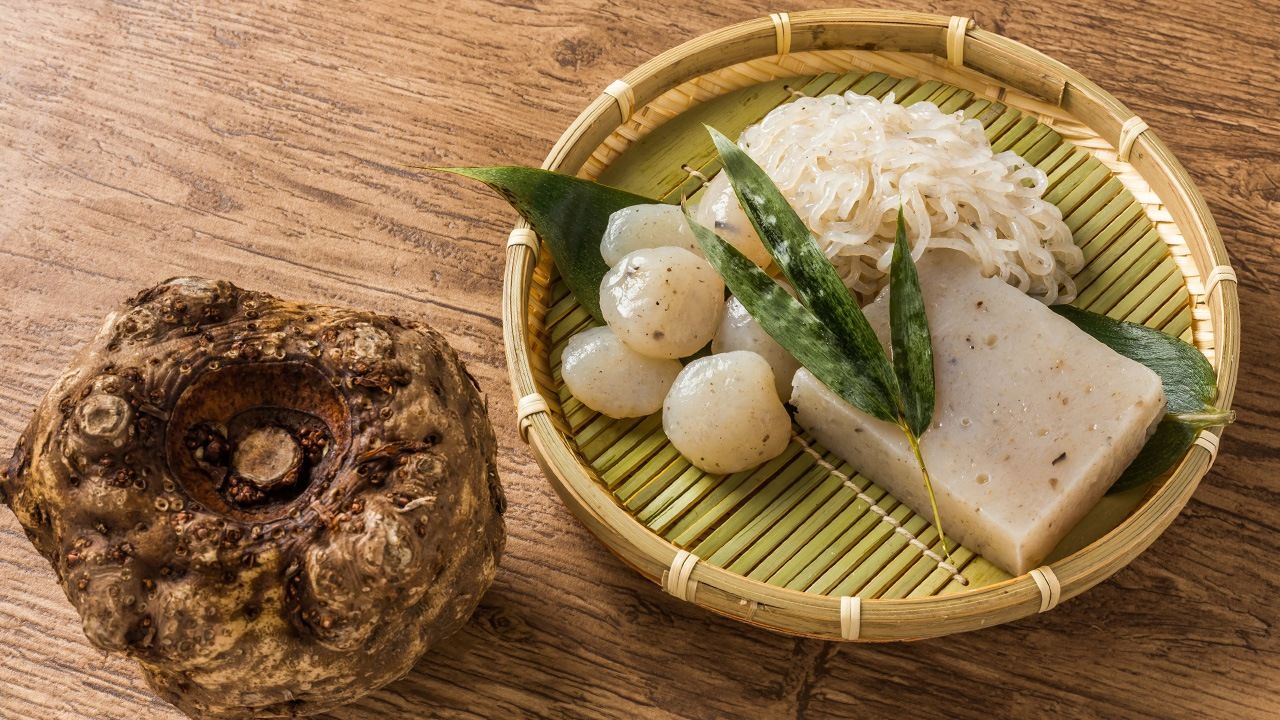 Escribe un artículo en francés sobre: Platos con ‘konjac’, un ingrediente muy bajo en calorías…