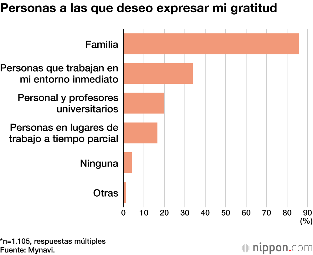 Los principales destinatarios de dicha gratitud (respuestas múltiples) fueron la familia, con un 85,8 %. Le siguieron “las personas que trabajan a mi alrededor”, con un 34,0 %, y “el personal y los profesores de la universidad”, con un 19,9 %.