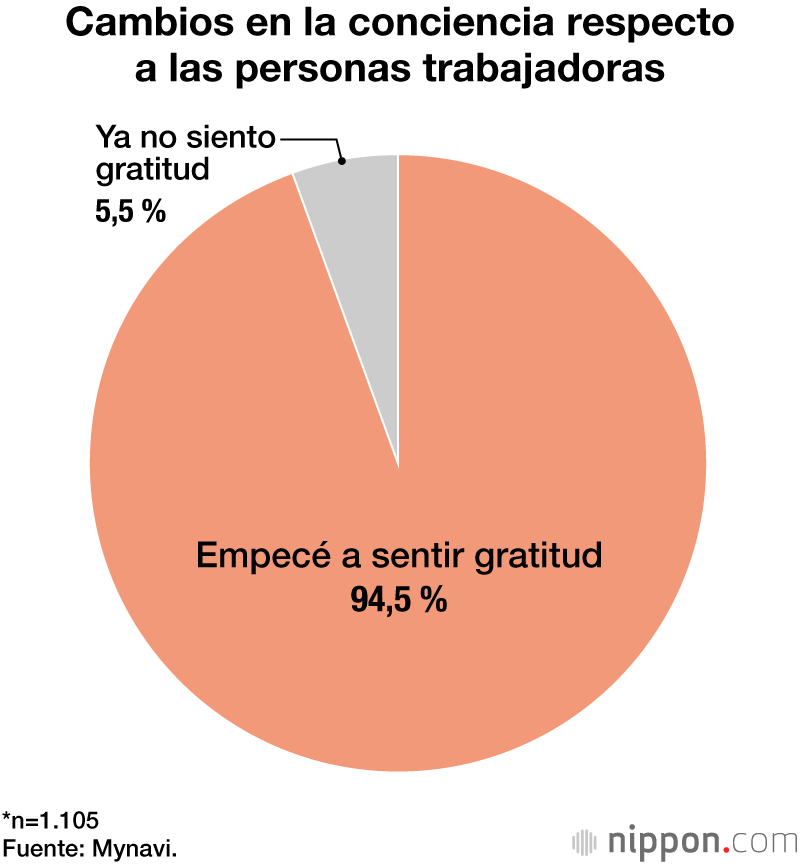 Un sondeo realizado a través de internet en octubre de 2025 por Mynavi Corporation (Tokio), una empresa de servicios integrados de recursos humanos, reveló que el 94,5 % de los universitarios encuestados empezó a sentir gratitud hacia los trabajadores a raíz de su experiencia en la búsqueda de empleo. La encuesta se llevó a cabo entre estudiantes universitarios y de posgrado que se graduarán en marzo de 2026, y se obtuvieron 1.105 respuestas válidas.