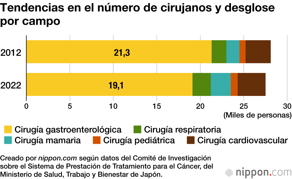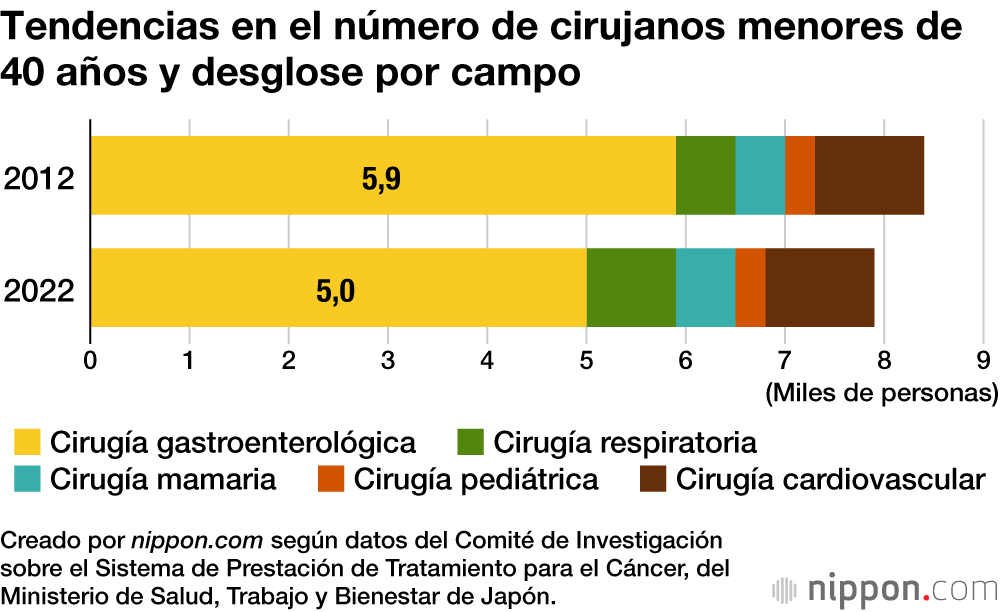 Se prevé que, a medida que disminuye la demanda de operaciones, el número de médicos que realizan operaciones oncológicas disminuya a un ritmo mucho más rápido. El número de cirujanos gastroenterológicos, en particular, ha disminuido un 10 % en los últimos 10 años, hasta unos 19.000 en 2022. Esta tasa de descenso es aún mayor entre los médicos jóvenes, de 40 años o menos, grupo en el que ha alcanzado el 15 %. Se ha señalado que la razón es que los médicos jóvenes tienden a evitar condiciones laborales exigentes, como operaciones prolongadas y atención a urgencias en días festivos y por la noche.