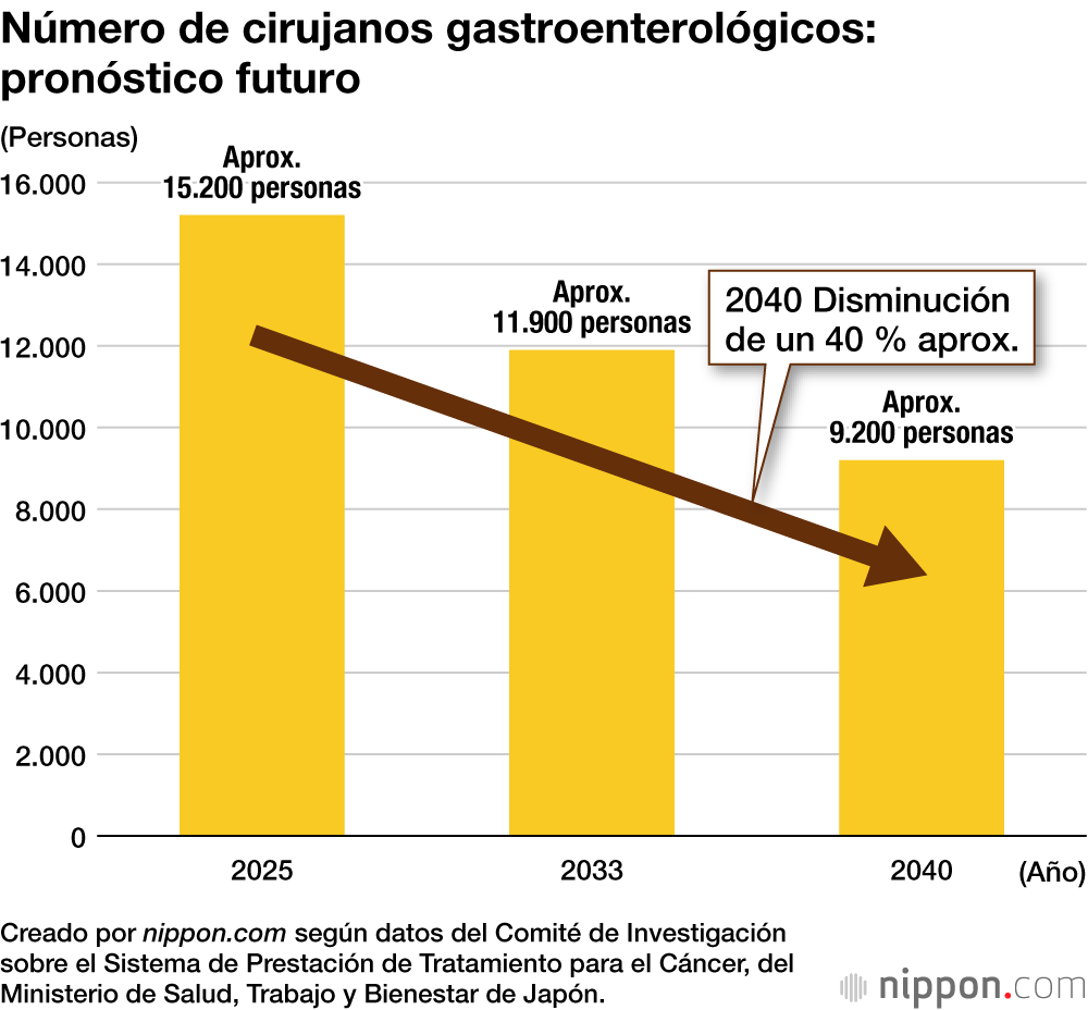 El comité estima que si la situación actual continúa, el número de médicos (menores de 65 años) afiliados a la Sociedad Japonesa de Cirugía Gastroenterológica disminuirá aproximadamente un 39 %, de 15.200 en 2025 a 9.200 en 2040. Considerando la demanda futura de operaciones, el comité predice una escasez de 5.200 médicos.
