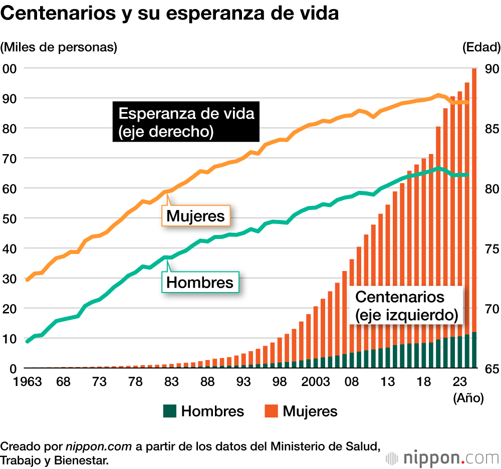 Según el Registro Básico de Residentes, a 1 de septiembre de 2025 había 99.763 personas centenarias en Japón, lo que supone un aumento de 4.644 respecto al año anterior. El número de personas de cien años o más lleva 55 años aumentando. Los japoneses son conocidos por su longevidad, especialmente las mujeres, que representan la mayoría de las personas centenarias con un 88,0 % del total.