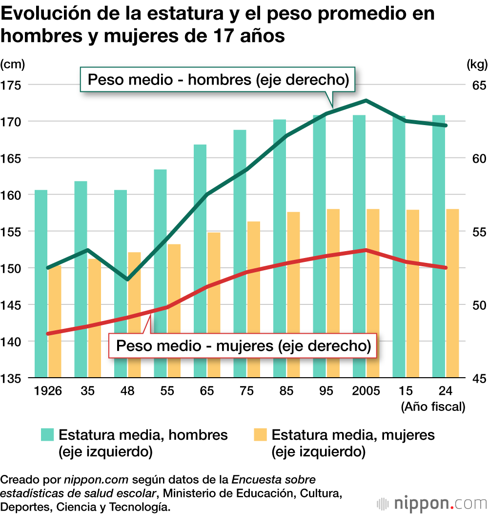 El Ministerio de Educación, Cultura, Deportes, Ciencia y Tecnología de Japón registra anualmente la estatura y el peso promedio de los estudiantes en sus estadísticas de salud escolar desde el año fiscal 1900 (era Meiji 33). No hay registros de los años 1940 a 1947. La estatura promedio de los jóvenes de 17 años en 1926 era de 160,6 cm para los hombres y 150,3 cm para las mujeres. En 2024 estas cifras alcanzaron los 170,8 cm y 158,0 cm, respectivamente, lo que representa un aumento de 10,2 cm para los hombres y 7,7 cm para las mujeres.