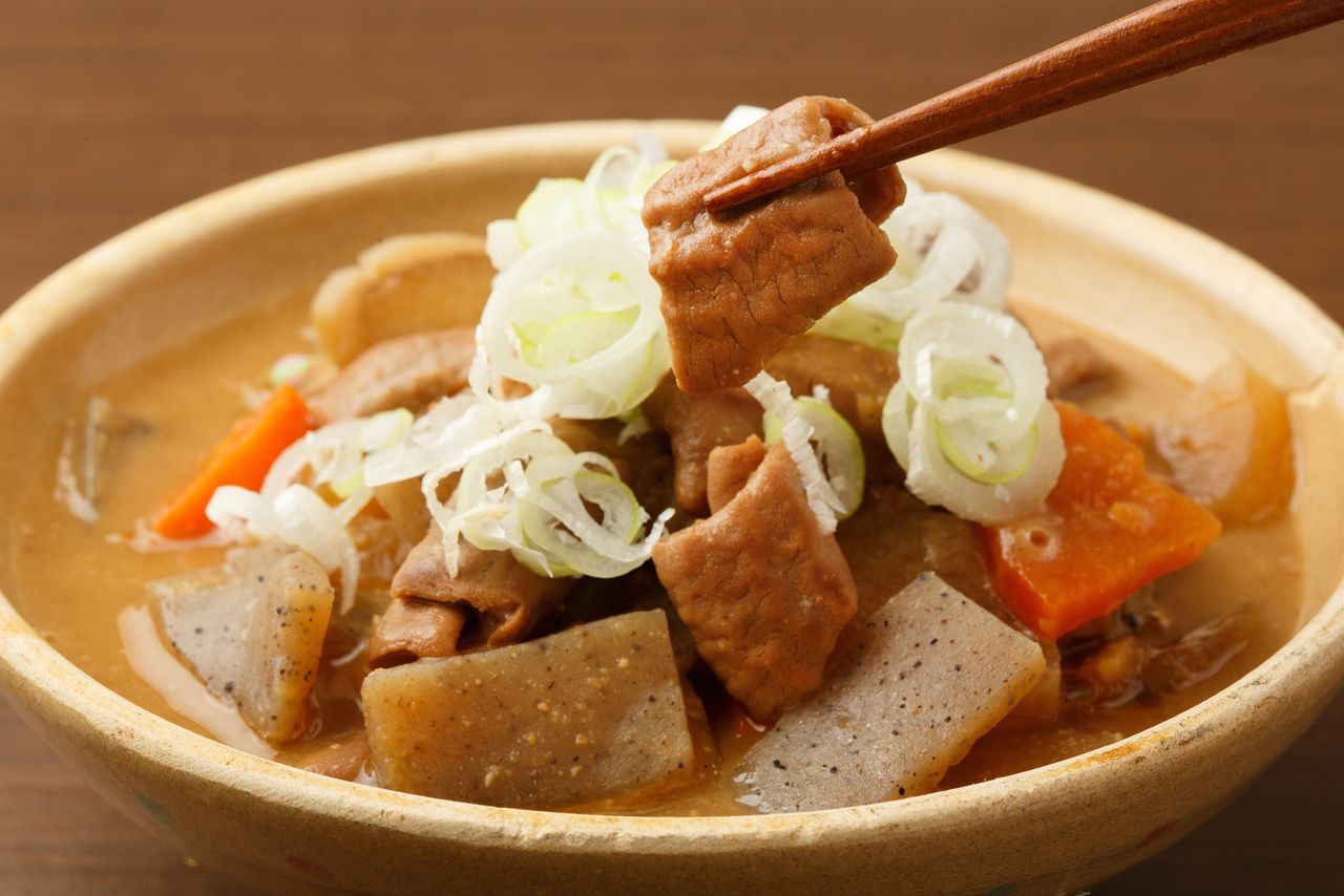 En este plato puede disfrutar de las diferentes texturas con las vísceras y las verduras. El konjac absorbe el sabor y le da un toque delicioso.