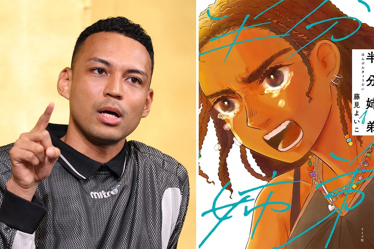 Izquierda: Andō Jose, ganador del Premio Akutagawa 2025. (Jiji Press) Derecha: Volumen 1 de Hanbun shitei, de Fujimi Yoiko. (© Fujimi Yoiko / Torch Web)