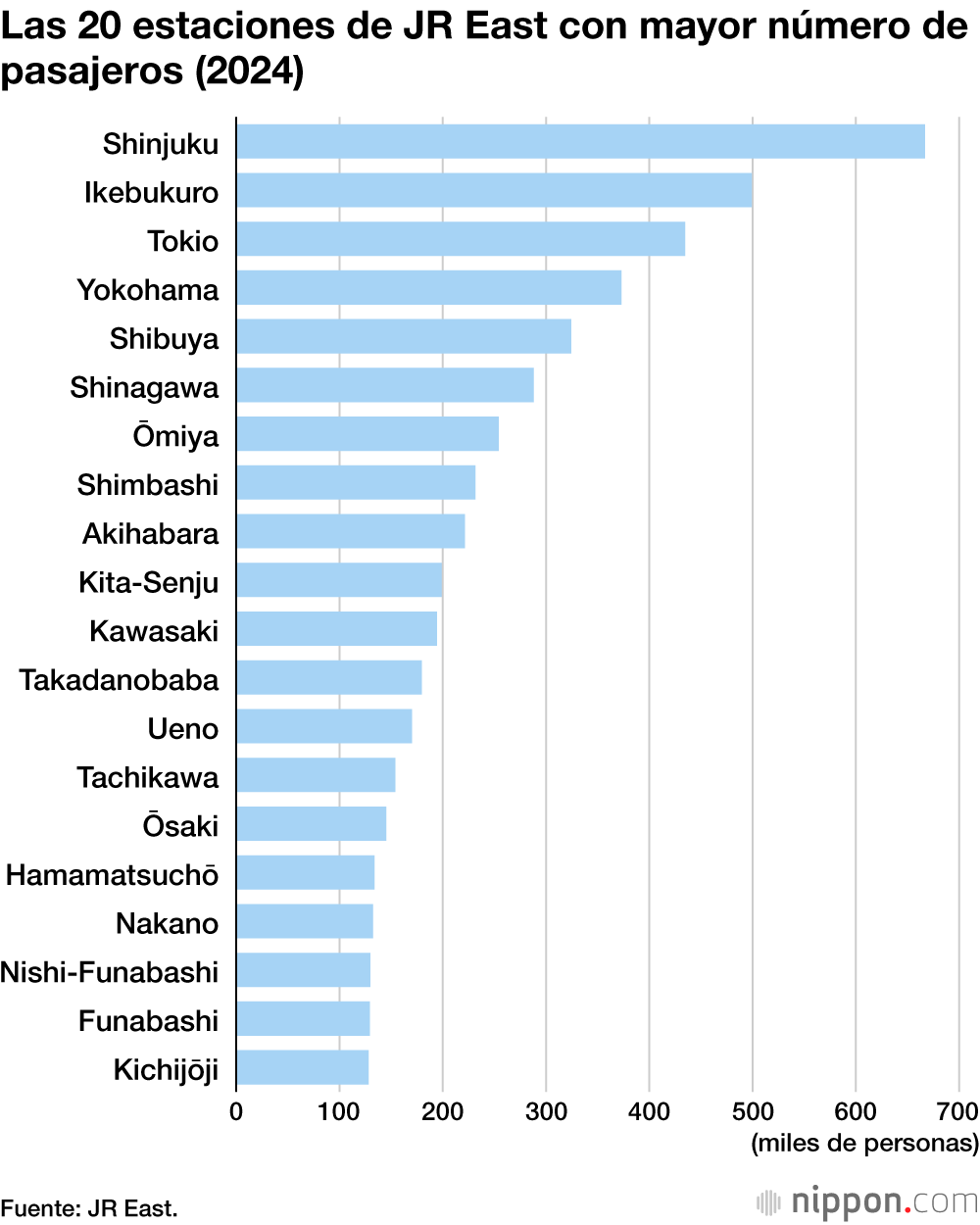 Según los datos publicados por la compañía ferroviaria JR East, el número promedio diario de pasajeros (solo los entrantes) por estación en el año fiscal 2024 tuvo como líder indiscutible a Shinjuku, con 666.809 usuarios diarios y un aumento del 2,5 % respecto al año anterior. Esta zona, donde convergen empresas, grandes almacenes y zonas de ocio, atrae de forma constante a una multitud. También es un punto de conexión con líneas de otras operadoras como Keiō, Odakyū, Tōkyō Metro y el metro Toei.