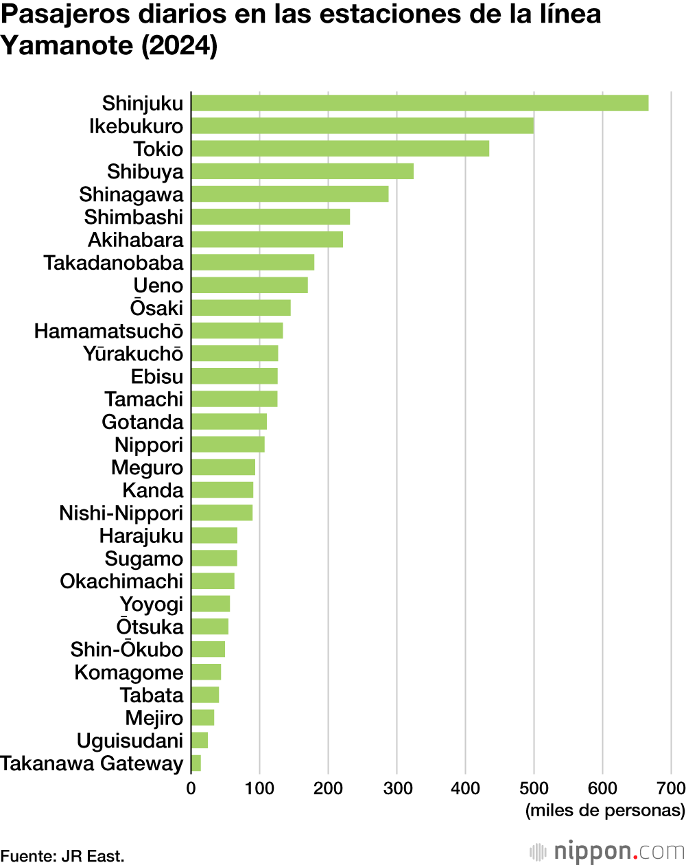 En el caso de Uguisudani, solo 24.460 personas la usan cada día, lo que representa una diferencia de más de 27 veces respecto a Shinjuku. Por su parte, Takanawa Gateway, la más nueva de la línea (inaugurada en 2020), registró 14.209 pasajeros diarios. Aunque se mantiene en el último lugar, su potencial de crecimiento es alto debido a los proyectos urbanísticos en desarrollo de la zona.