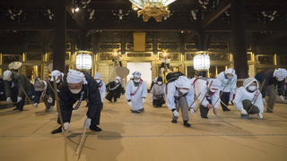 (Imagen del encabezado: varias personas limpian las esteras de tatami con palos de bambú en el templo Higashi Honganji. © Kyōdō.)
