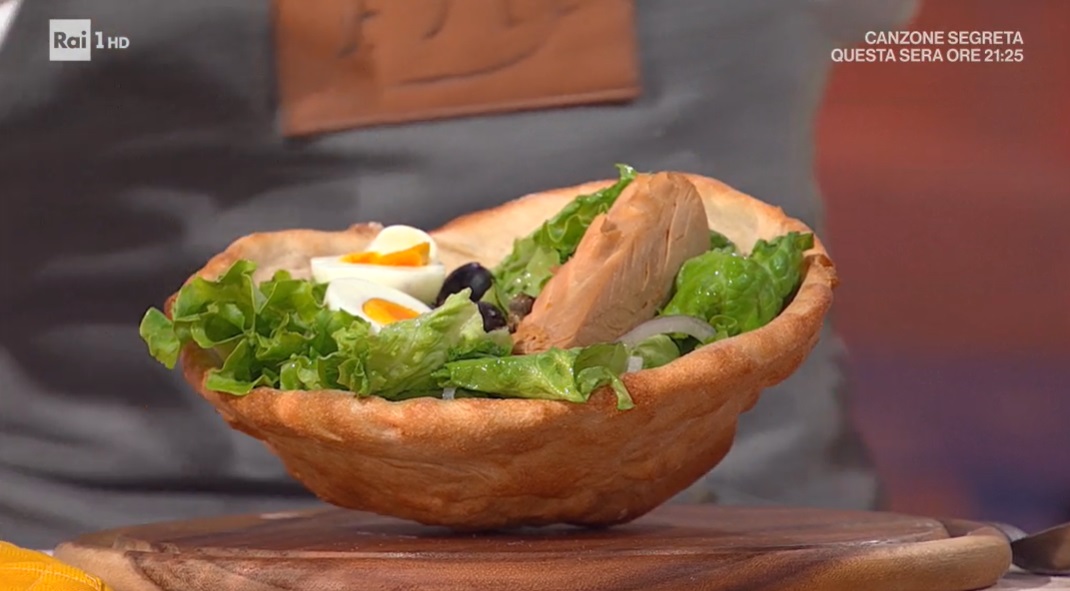 Ungiamo con l’olio un contenitore a mezza sfera che possa andare in forno. Stendiamo un panetto di pasta sottile, anche sui bordi. Lo adagiamo sul contenitore a mezza sfera e cuociamo in forno caldo e statico a 240° per 20 minuti: 10 minuti con il contenitore, gli ultimi 10 senza contenitore e capovolto, in modo che possa dorarsi anche all’interno. Farciamo il cesto a piacere, con insaltine o altro.