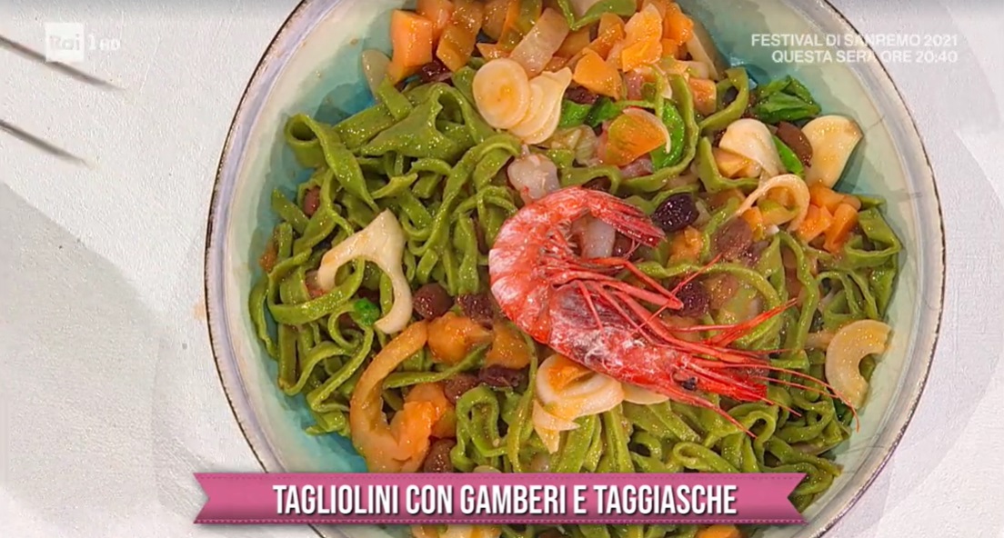 In vista della domenica, zia Cri tira la sfoglia, verde e sottilissima, a regola d’arte. La cuoca romagnola prepara un primo piatto profumatissimo, dedicato a Sanremo. Ecco i tagliolini con gamberi e taggiasche.