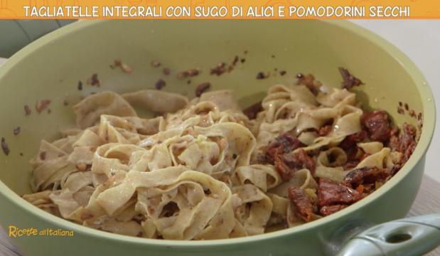 Dalle Ricette all’italiana di oggi 5 novembre 2020 la ricetta di Anna Moroni delle tagliatelle integrali con sugo di alici, un primo piatto delizioso, semplice ma goloso. Anna Moroni mostra ad Annabruna come si fanno le tagliatelle, come si fa la pasta fresca fatta in casa ma non è davvero semplice. Pomodori secchi tritati al coltello, le alici sott’olio, la mollica di pane raffermo tostato, aglio e se vogliamo anche un po’ di peperoncino ed ecco il primo piatto di oggi di Anna Moroni per le nuove Ricette all’italiana. Non perdete questa e le altre ricette in tv su Rete 4 e non solo.